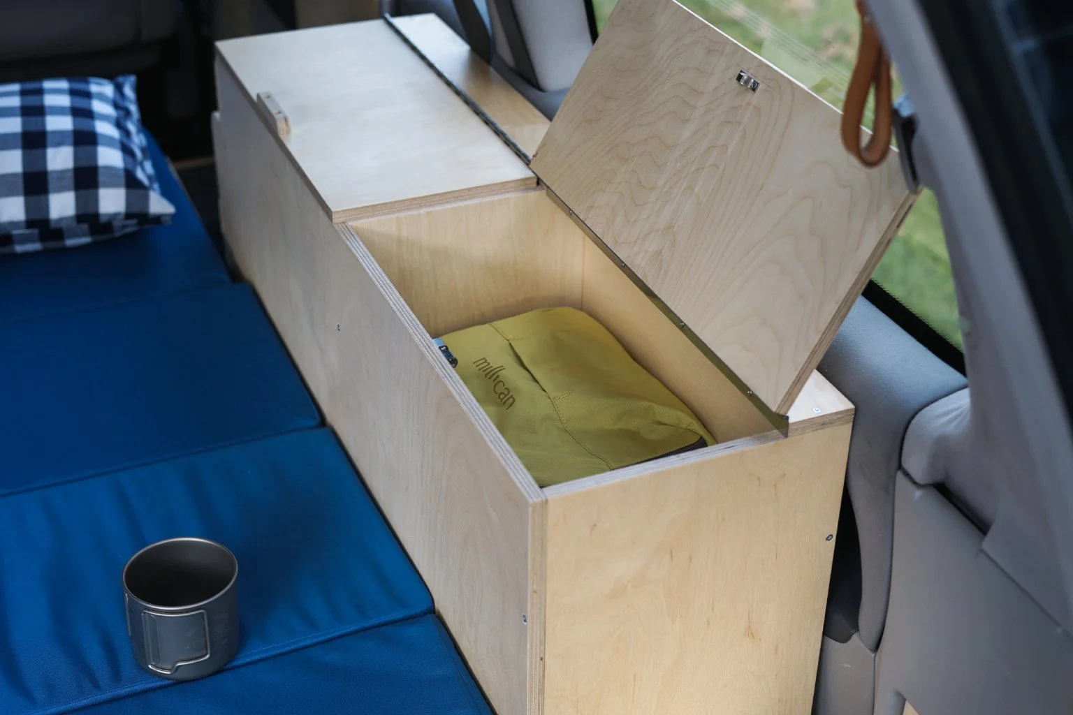 Lots of sketches and research later we decided upon the design of the camper unit MKII. By now we had given up on the idea that the unit should be removable and opted to prioritise comfort and storage space. We wanted a bench seat that we could sit on facing either in or out of the van, the back rest of the seat would also double as the support for the fold out bed. We wanted storage for large items such as a cooler, rucksacks and sleeping bags, and we needed cupboards and a surface onto which we could at least boil some water on our hiking stove in case we were forced inside by the rain. We built all this from 2 large sheets of 12mm birch ply plus a couple of piano hinges so the cost has been very modest in relation to the added functionality we’ve gained. We made cushions for the bench that double as a mattress and replaced the flimsy sliding factory fitted curtains with heavyweight blinds that are secured to the van with self tapping poppers. We also made a folding table which is supported by a telescopic leg and a few other storage trays for smaller bits and pieces. See the photos above to see how it turned out!